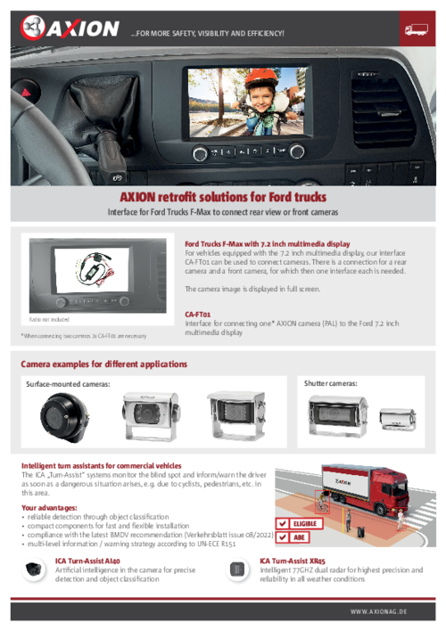 Interface for connecting one* AXION camera to Ford Trucks F-MAX models with 7.2-inch touchscreen multimedia display.