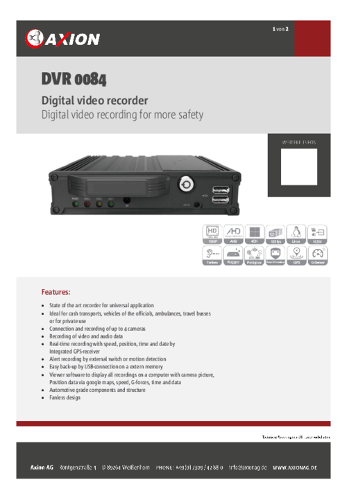 Video-input 4 (AXION MiniDIN) Video-output 1 (RCA) / 1 (HDMI) Audio-output 1 (RCA) USB- slots 2 Alarm-in 8 Alarm-out 2 Storage media SSD HD max. 2TB Power supply 12/24 V Operating temperature range -20 °C bis + 70 °C Dimensions (B x H x T) 160 x 165 x 47 mm Weight ca. 1100 g Certification CE,FCC,E-Mark,CLASS-B -