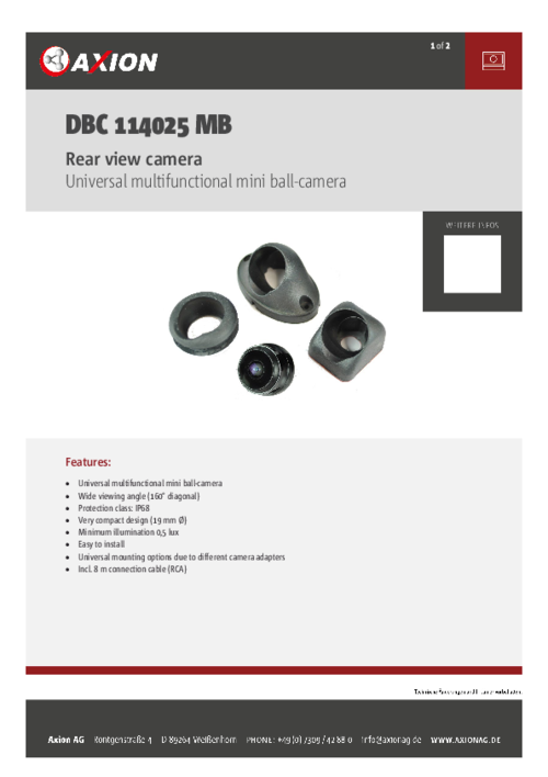 Image-Sensor 1/4 " CCDS Sensor Resolution 921.000 pixels Visual angle 160° (H: 130° / V: 80°) Lens Illumination 0,5 Lux Video-System NTSC Mirror-Function yes Camera-Input RCA Protection class IP 68 Operating temperature range -30 °C bis + 70 °C Vibration resistant Shock resistant Power supply 12 V Power consumption max. 40 mA Dimensons (WxHxD) 19 mm Weight 20 g Certification ECE-R10 -