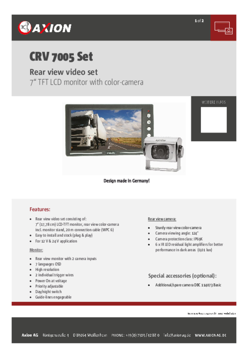 Complete professional Rear View System with Color Camera, incl. Monitorstand, 20m cable. Easy to install & connect - Plug & Play. For 12V and 24V use.
