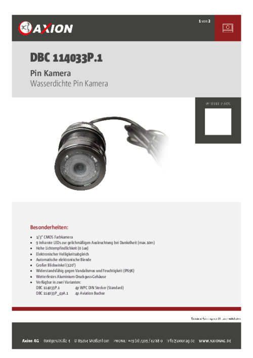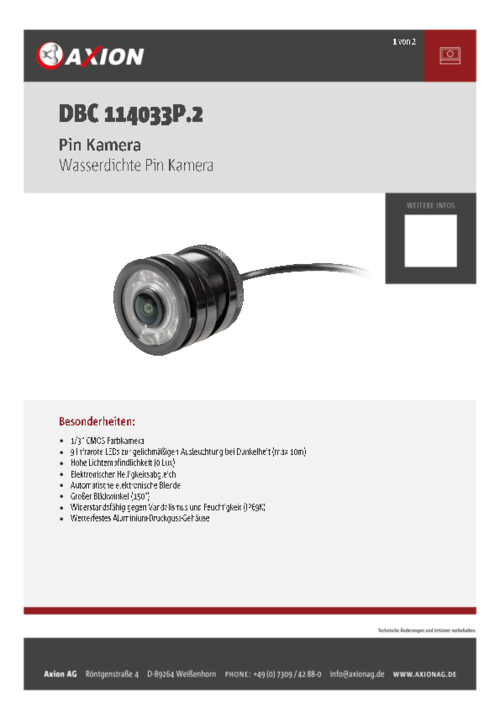 150° (DBC 114022P.2)Lichtempfindglichkeit 0 Lux (mit IR) Anschluss 4p WPC DIN Schutzklasse IP 69K Betriebstemperatur -20 °C bis + 70 °C Vibrationsfestigkeit 4,5 G Spannungsversorgung 12 V Abmessungen (Durchmesser x Tiefe) 35 x 35 mm Gewicht 90 g Prüfzeichen, Zertifikate ECE-R10 -