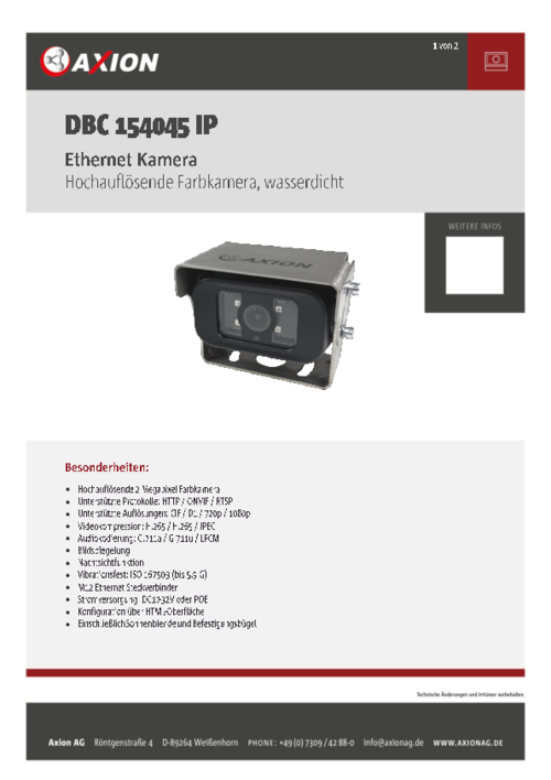 Bildsensor 1/2.9“ CMOS Farbkamera / 2 Megapixel Auflösung 1920(H) x 1080(V) / 1080p Blickwinkel 130° diagonal Dynamikbereich 81 dB Auflösung Main Stream D1/720P/960P/1080P Auflösung Sub Stream CIF/D1 Bildwiederholrate 2 bis 30 fps Bitraten-Steuerung CBR/VBR/ABR AGC automatisch Weißabgleich automatisch Reichweite Nachtsicht 10 m Spannungsversorgung 10 - 32 V DC / IEEE 802.3af POE Ethernet 100BASE-TX / FastEthernet Ethernet Stecker M12 D-coded female - 4 Pin Arbeitstemperaturbereich -20 °C bis +70 °C Lagertemperaturbereich -30 °C bis +80 °C Schutzart IP69K Vibrationsfestigkeit ISO 16750-3 / bis 5,9 G Abmessungen (BxHxT) 77x43x52 mm (ohne Montagebügel und Sonnendach) Prüfzeichen CE, ECE-R10 -