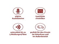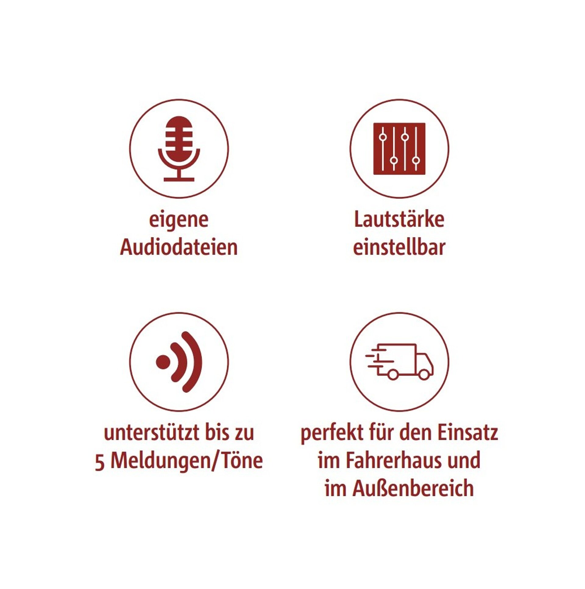 Über den Multifunktions-Alarm werden Personen in der Fahrerkabine oder rund um das Fahrzeug informiert und gewarnt. In Gefahrensituationen helfen die Warnungen, Unfälle zu vermeiden. Für die optimale Verwendung am jeweiligen Fahrzeug kann zum einen die Lautstärke eingestellt werden, und die Lautsprecherausgaben können als Sprachansagen oder Geräusche individuell aufgenommen und programmiert werden.