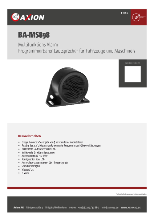 Anzahl Alarme 5 Lautstärke 45/55/70/75/85/90 dB Anzahl Triggereingänge 5 Audio-Dateiformat MP3/WAV Stummschaltsignal ja Spannungsversorgung 9-36 V DC Leistungsaufnahme 6 W Betriebstemperatur -30 °C bis +70 °C Lagertemperatur -40 °C bis +80 °C Abmessungen (BxHxT) 89x70x36 mm Lautsprecher Ja Schutzart IP69K (wasserdicht) Prüfzeichen, Zertifikate ECE-R10, CE -